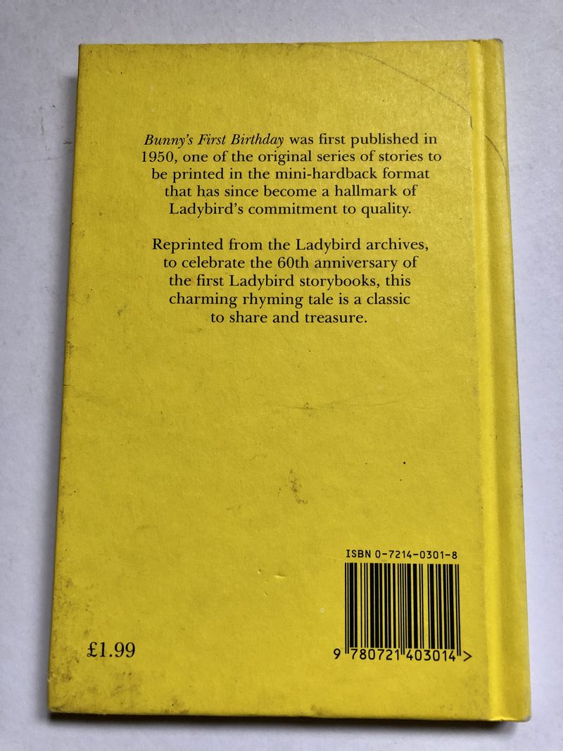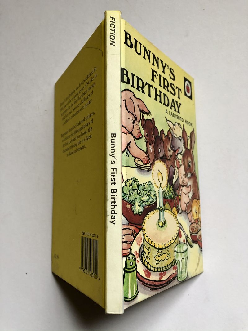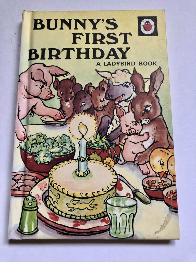 The original Bunny’s first Firthday was first published in 1950.  It was the 12th of the Animal Rhyming stories of series of 401.  The 401 series is significant in the Ladybird story because these books were the first ones published in the format that was to become the classic Ladybird format: small size, with text on the left and a full-page illustration on the right. After the early 1940s, all the books in this series were written in jaunty rhyme by Walter Perring and were illustrated by Angusine Macgregor.  The effect of this rhyme was to lodge in the memory of the young child.  Ask anyone who enjoyed this book as a child and the chances are they can still quote parts of the rhyme decads later.