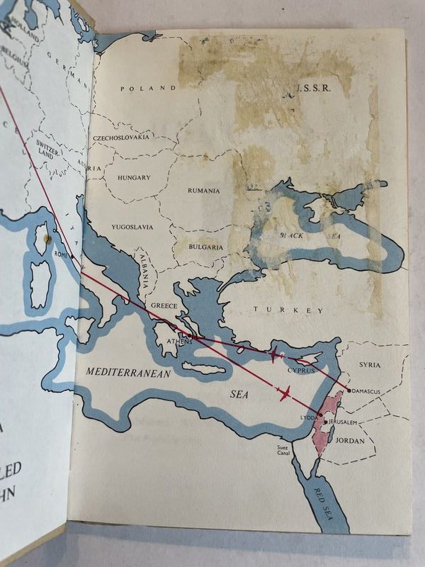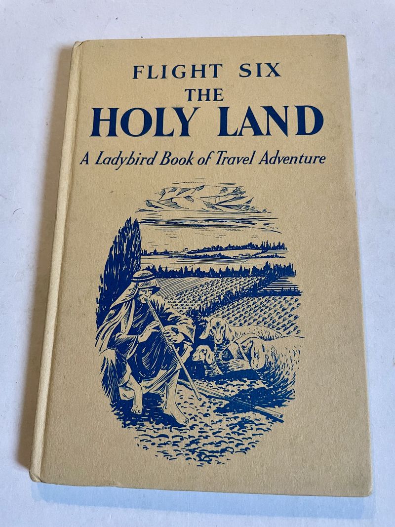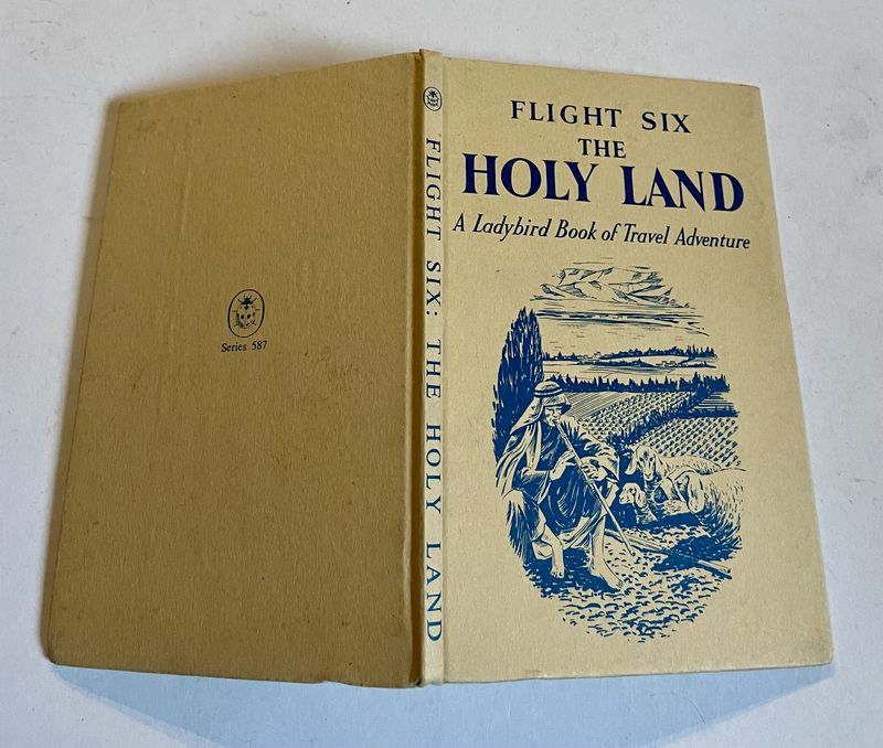 Flight six The Holy Land was the 6th and last of the Travel Adventure series, 587, written by David Scott Daniell and boldly illustrated by Jack Matthew. The series featured two children, Alison and John accompanying Daddy on exciting trips around the world. Alison and John are very eager beavers, always keen to research their destination, study maps and learn more about social and geo-political history. So this makes them fascinating reading today – capturing as it does the lingering assumptions of empire, of Commonwealth and of a burgeoning new world order that still places Britain at its centre. The early versions of the book are to be found with dustwrapper. This book steers a careful path through an area of geo-politics that must have been problematic even at the time. The choice of the name ‘Holy Land’ probably reflects this.