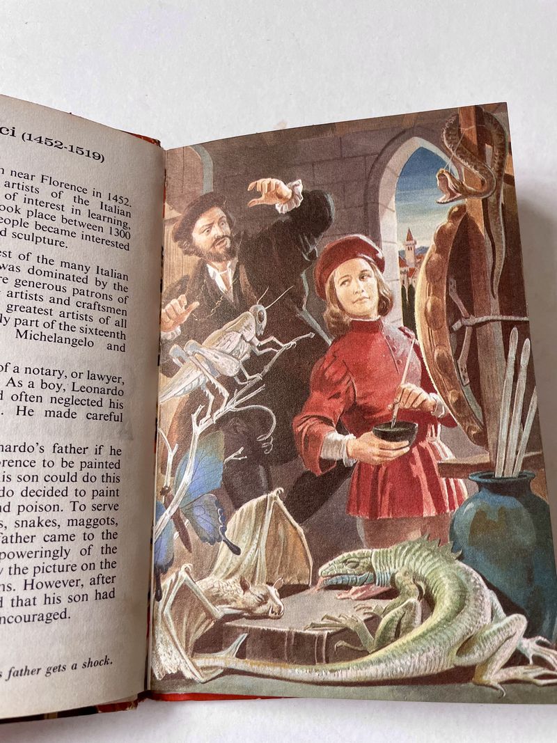 A Ladybird Book of Great Artists, book 2 first published in 1970 and was (not surprisingly) the 2nd of the three Artists books in series 701. It was something of a family affair – colourfully illustrated by Martin Aitchison and written by his wife Dorothy. Dorothy and Martin met at art college. She went on to become an art teacher and so her knowledge of art history helped her to pitch this book perfectly. Martin’s illustrations in this series (and in the Great Composers books) are filled with evidence of his sense of humour and delight in gentle mischief. In these three books, he relished the rich vein of pastiche that opened up when painting pictures for a book about people painting well-known pictures. Book 2 covers the artists Da Vinci, Raphael and Michelangelo.