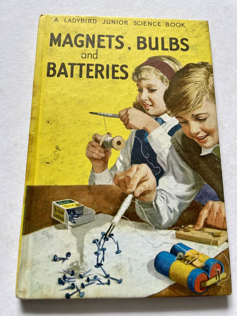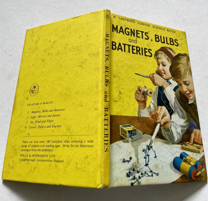 Magnets Bulbs and Batteries, 1962 was the 1st book to be issued in series 621 – Junior Science – and was originally issued with a dustwrapper. It was written by Newing and Bowood and, like all the books in this series, was beautifully, lovingly illustrated by Harry Wingfield. If you aren’t familiar with the series, all four of them are beautiful books, which is not what you might expect from the titles. But Wingfield’s warm, nostalgic watercolour illustrations tenderly depict the cotton-reels, paperclips, corks and tin cans of a 1960s/70s childhood whilst at the same time clearly illustrating the experiment presented on each page. These books are also remarkable for their depiction of boys and girls equally active in their experiments with motors, cogs, wind-socks and circuits.
