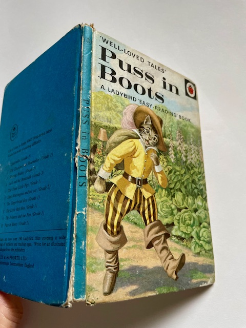 Puss in Boots, matt boards, illustrated by Eric Winter.  This copy has heavy wear to the spine and corners and the spine paper is torn and lifting in a couple of places.  The pages are well-turned and there’s the odd spot, small tear or blemish – but it is essentially sound and is the rare first edition (tally number 190).