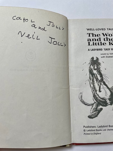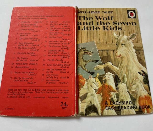 The Wolf and the 7 Little Kids, matt boards, Illustrated by Robert Lumley. This book is in good condition inside and out. It’s quite a hard title to find in decent condition. There’s heavy wear to the spine and corners, ticks on the back cover and other minor blemishes. This copy dates to the 1970s and has an original price of 24p on the back.