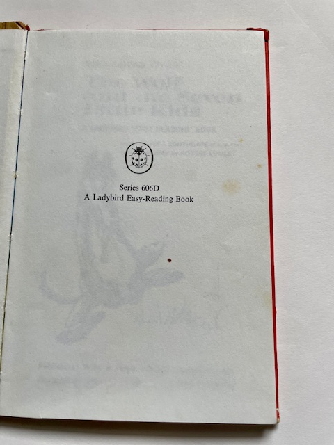 The Wolf and the 7 Little Kids, matt boards, Illustrated by Robert Lumley. This book is in decent shape but has a lot of wear to the spine (all intact but very rubbed and scuffed). Lots of wear to all edges and corners and the odd minor dot, crease or blemish. It’s quite a hard title to find in decent condition. The reading pages are generally well-turned but clean. This copy dates to around 1970 and has a revised price of 2/6/12.5p on the back.