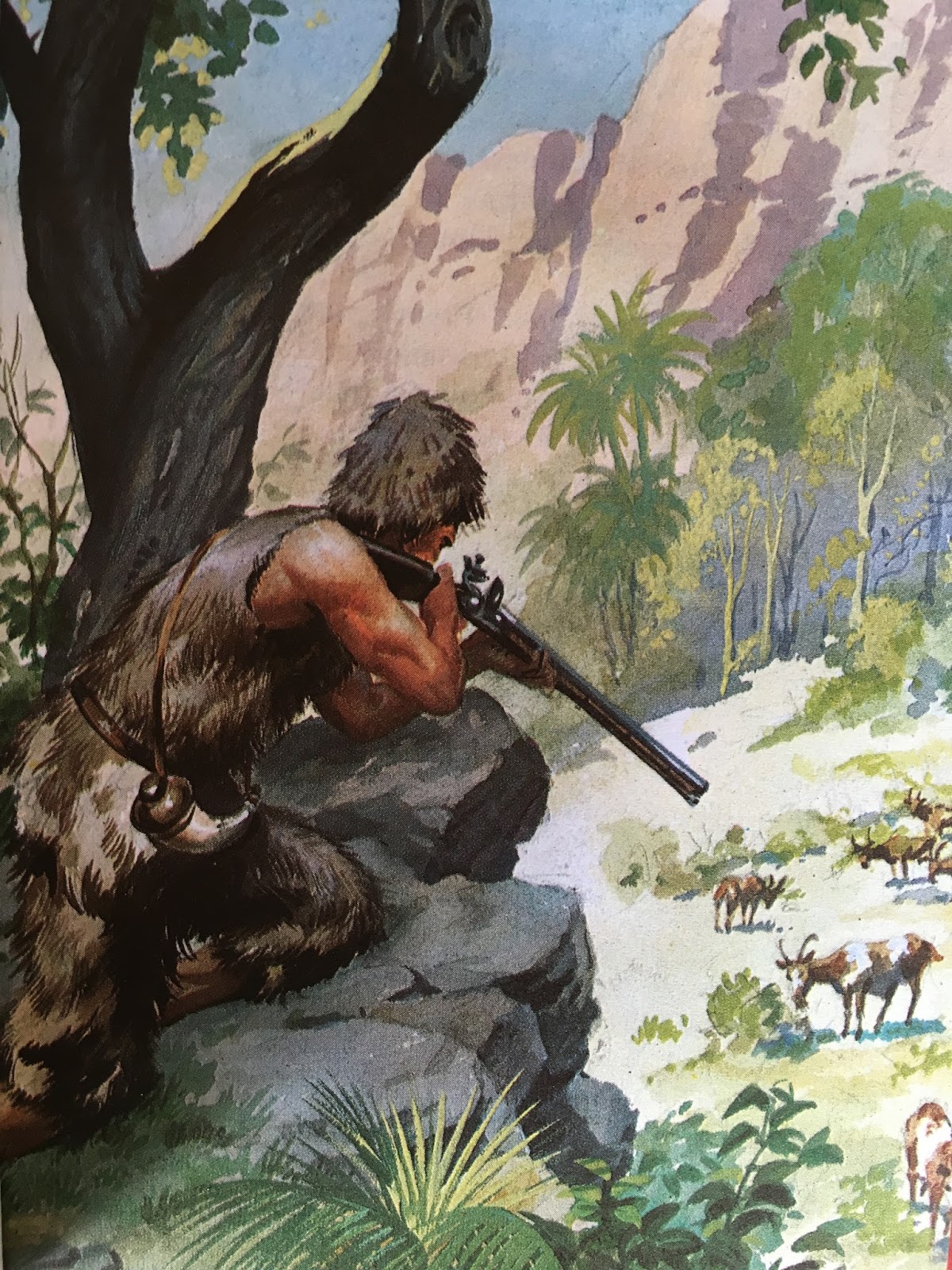 A slightly more subtle example by Frank Humphris can be found in this picture of Alexander Selkirk, ‘The Story of Pirates’ and White Bird Canyon (The Story of Indians).