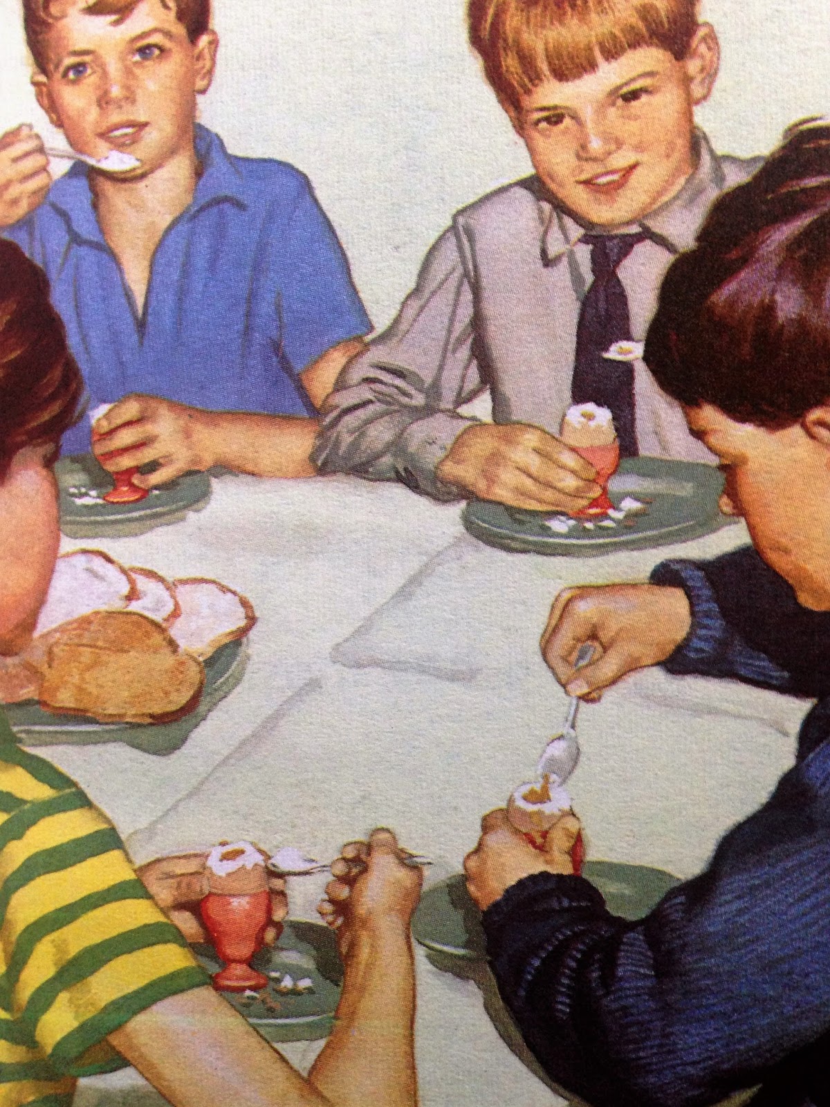 Eggs are another example of the spirit of the times lurking quietly in domestic detail. I eat eggs today; I ate eggs when I was little (in the late 60s). But looking through Ladybird Books of the late 50s to early 70s it’s clear that eggs today aren’t what once they were. Eggs loomed larger in our lives. Eggs weren’t about mayonnaise or quiche or souffle or even omlettes. They were about poached, boiled, fried or scrambled. Particularly, if Ladybird artwork and my memory are correct, about boiled.
